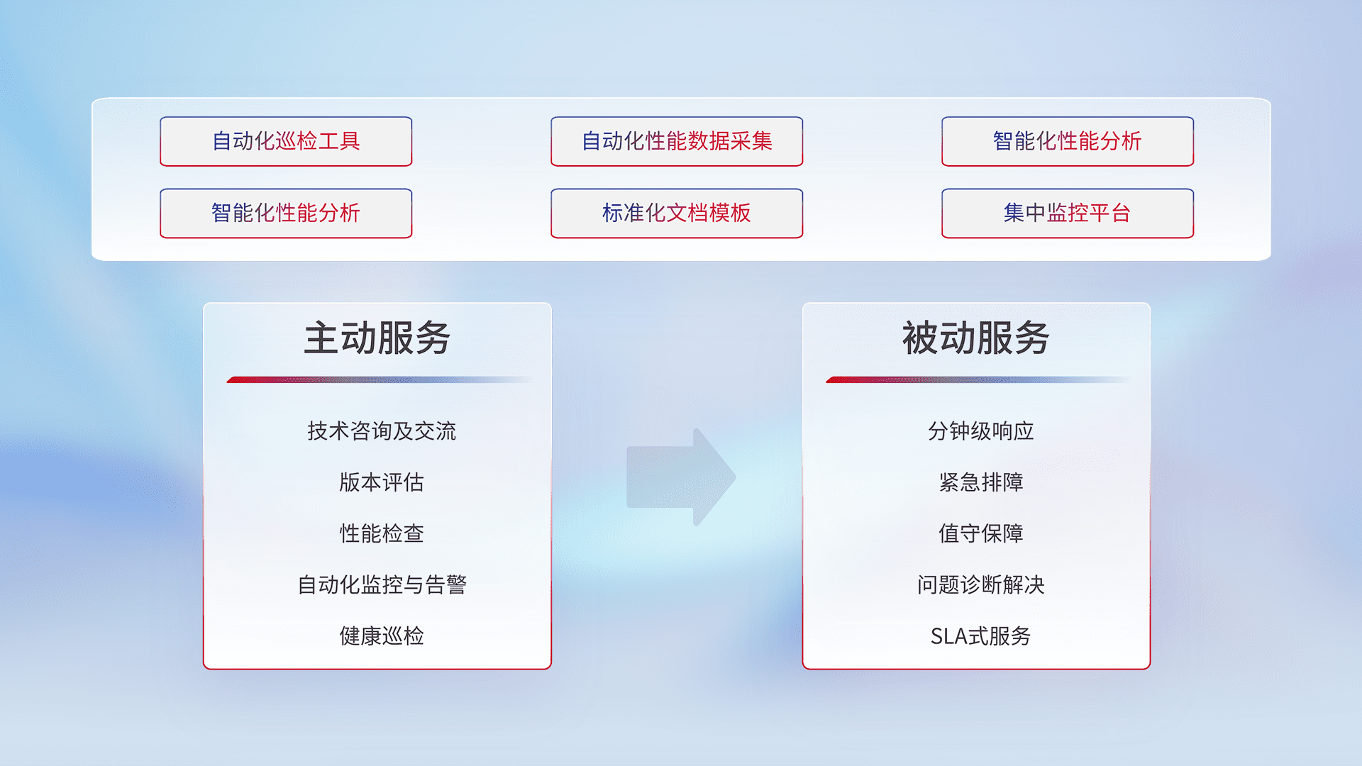 智能化工具和标准化文档,,,,保障服务质量,,,提供主动服务(包含技术咨询、、、、版本评估、、、、性能检查、、、自动化监控与告警、、、健康巡检)和被动服务包含(分钟级响应、、、、紧急排障、、值守保障、、、问题诊断解决、、、SLA服务)。。。